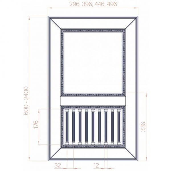 Комбинируется со стеклом и балясинами. Балясины h=176мм. Нижняя часть фасада имеет неизменную высоту. Увеличивается по высоте только верхняя часть.
