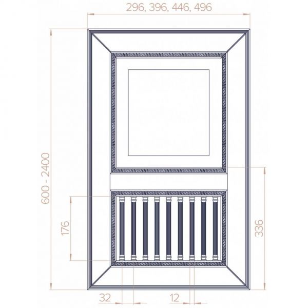 Комбинируется с филенкой и балясинами. Балясины h=176мм. Нижняя часть фасада имеет неизменную высоту. Увеличивается по высоте только верхняя часть.