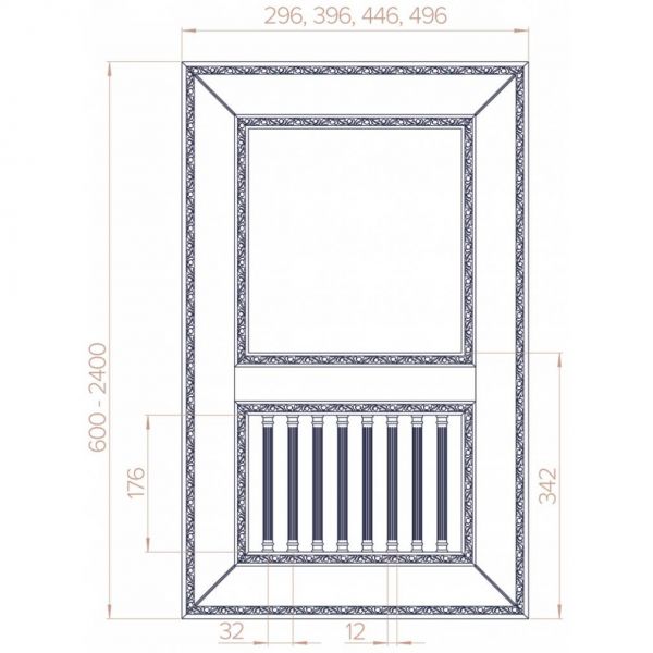 Комбинируется со стеклом и балясинами. Балясины h=176мм. Нижняя часть фасада имеет неизменную высоту. Увеличивается по высоте только верхняя часть.