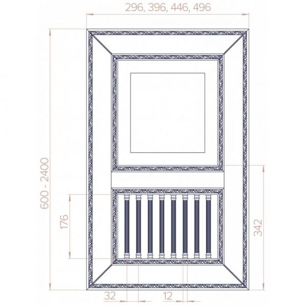 Комбинируется с филенкой и балясинами. Балясины h=176мм. Нижняя часть фасада имеет неизменную высоту. Увеличивается по высоте только верхняя часть.