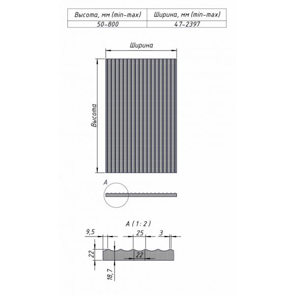 По стандарту, фасад по ширине начинается с 47 мм с шагом "волн" 25мм. Например: 47мм; 72мм; 97мм ...... 397мм.....447мм и т.д.